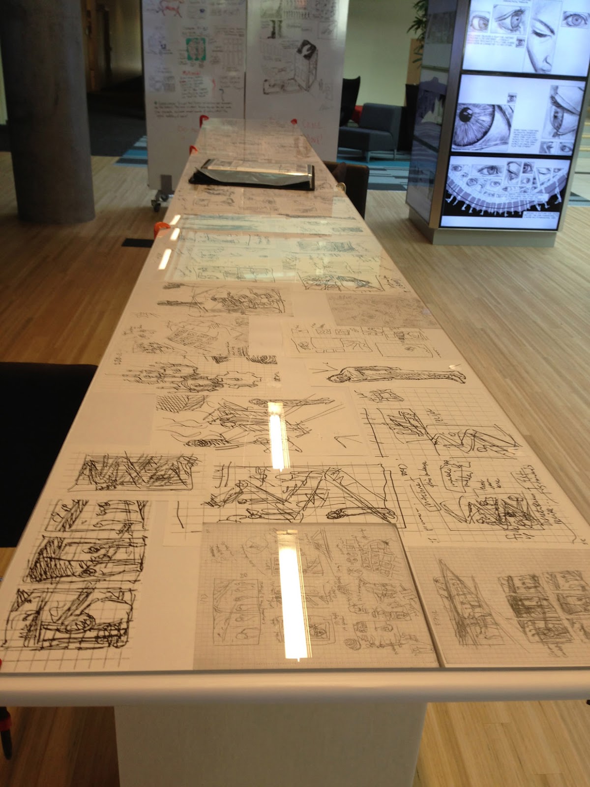 saccadic motion in the previous chapter, but it didn't quite work, and it fit neatly into what I was exploring here. Briefly, saccades are the rapid movements are eyes make several times a second, where they fix on a target and then zip off and focus on another. As Pelaprat and Cole (and others) surmise, it is the imagination that fills in the gaps, that creates a seamless whole from all these disconnected fragments. (I recommend their article "Minding the Gaps", which also discusses